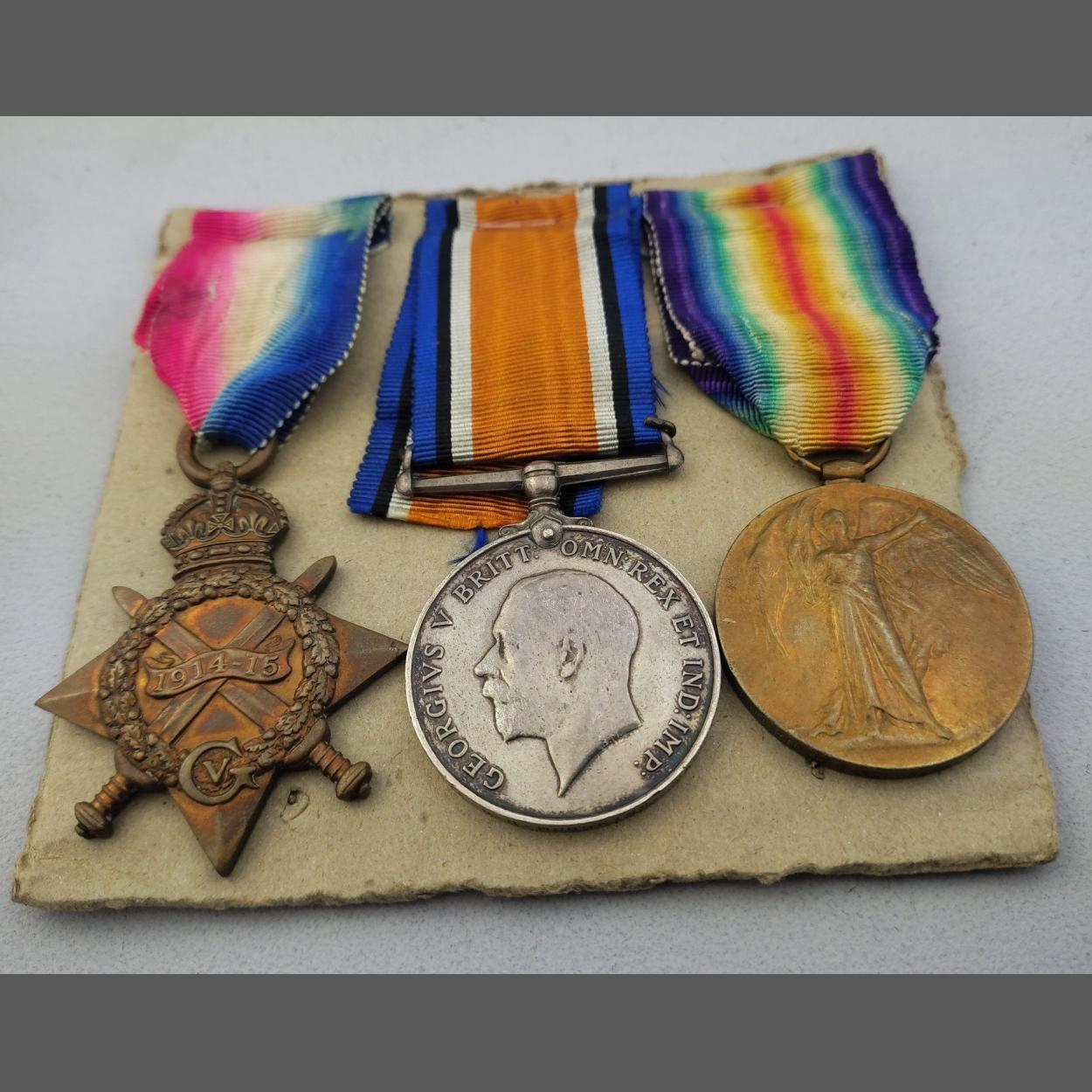 WWI Medal Trio 1914-1915 Star, BWN and Victory. Awarded to 1400 Pte. W.S. Hodgkiss Manchester Regiment.