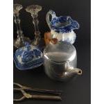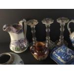 Mixed decorative and ceramic lot. Various vintage water jugs , a Picquot Ware tea pot, glass candle sticks, glove stretchers etc.