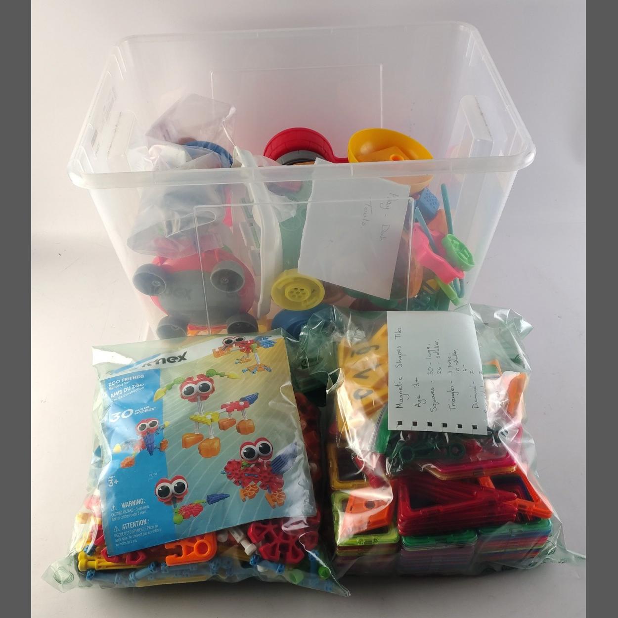 Selection of childrens toys to include kid k'nex "Zoo Friends", magnetics shape tiles and box of Play Doh tools