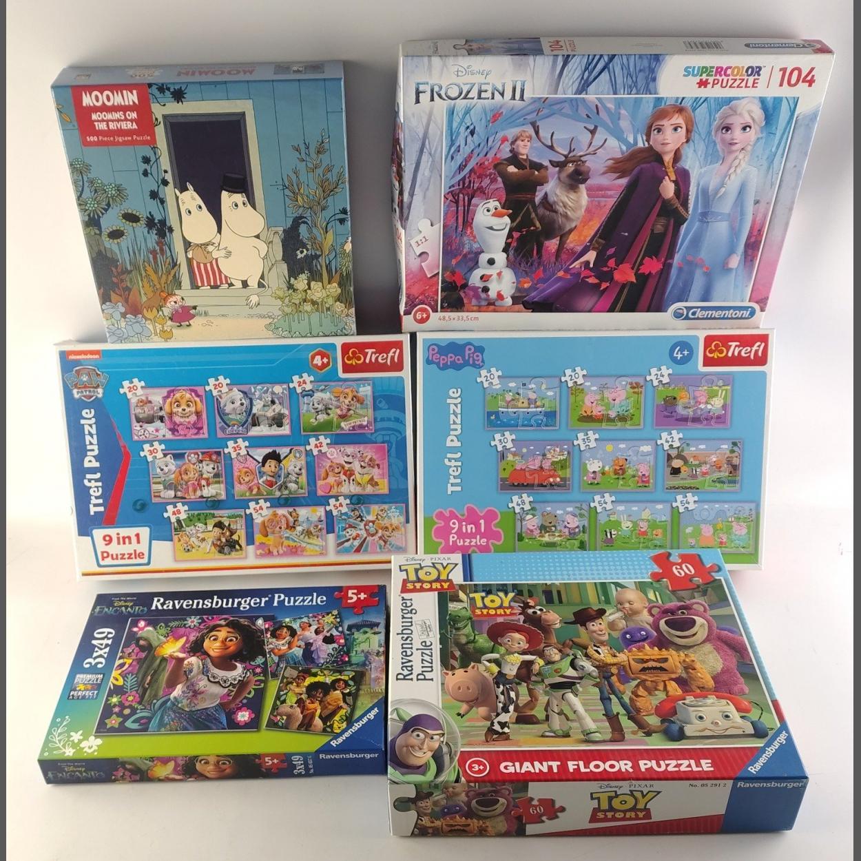 Bag of children themed jigsaws including Encanto, Toy Story, Moomin, Peppa Pig, sealed Paw Patrol etc