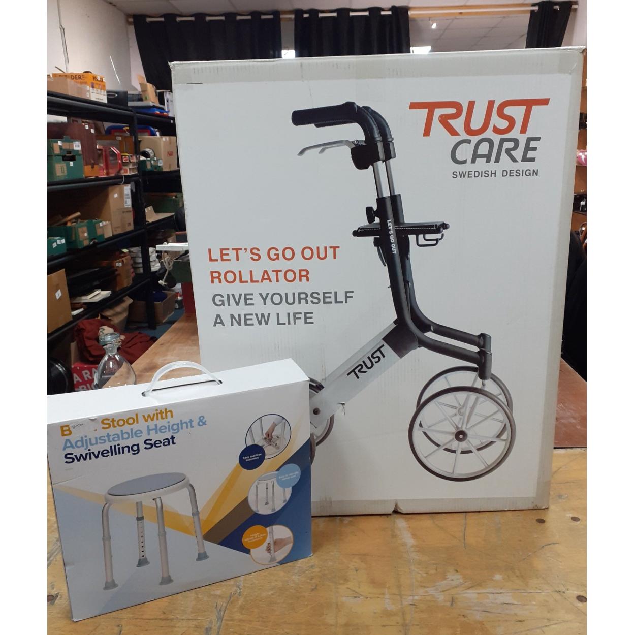 An unused TRUST CARE folding ROLLATOR walker plus a bath stool with adjustable height and swivelling seat from DeVilBiss Healthcare still in original box
