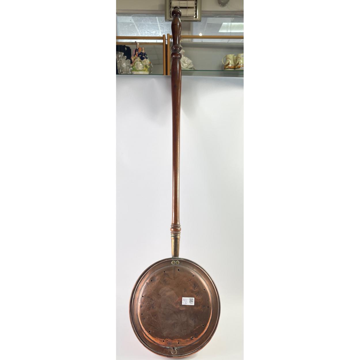 A copper warming pan with just discernible floral pattern, pan diameter 30cm approx and 120cm total length