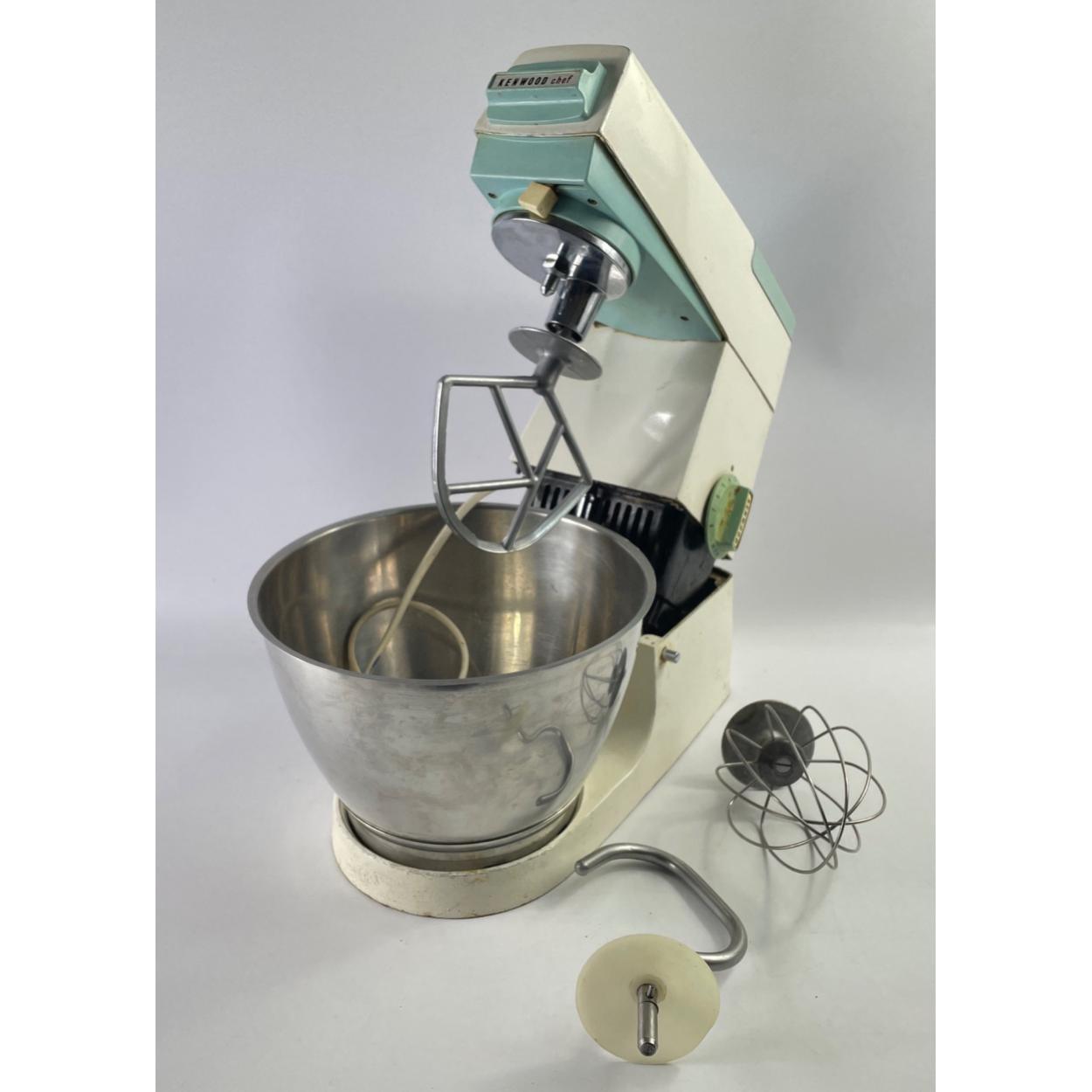 A vintage KENWOOD CHEF mixer in white with light blue trim complete with three mixing hooks