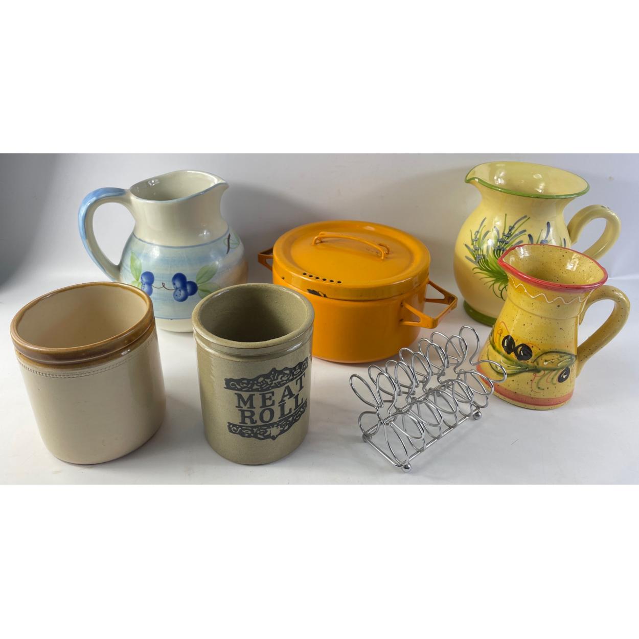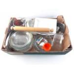 A box of mixed kitchen ware to include a MOIRA meat roll jar, 3 jugs, and a 2.5l metal casserole dish,