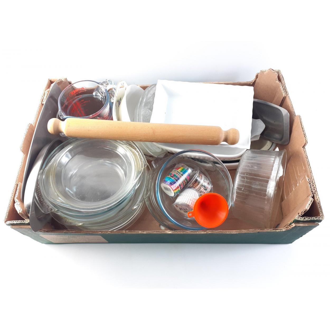 A box full of kitchen ware to include PYREX casserole dishes, measuring jugs, mixing bowls, souffle dish, and white ceramic gratin dishes and a wooden rolling pin etc