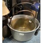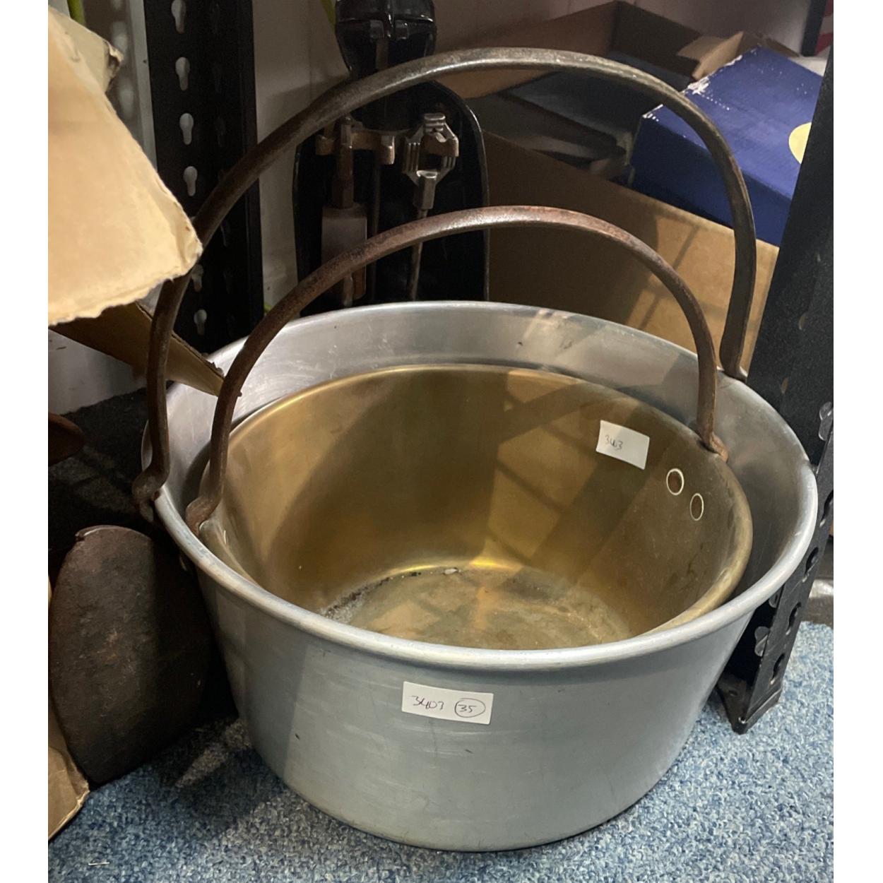 A VINTAGE large aluminium jelly pan dimension 35cm height x 18cm height approx with a medium sized brass jelly pan