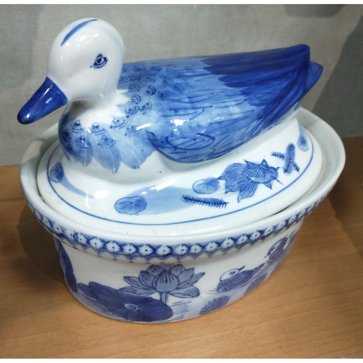 An attractive blue and white duck terrine standing 20cm tall, length 23cm approx