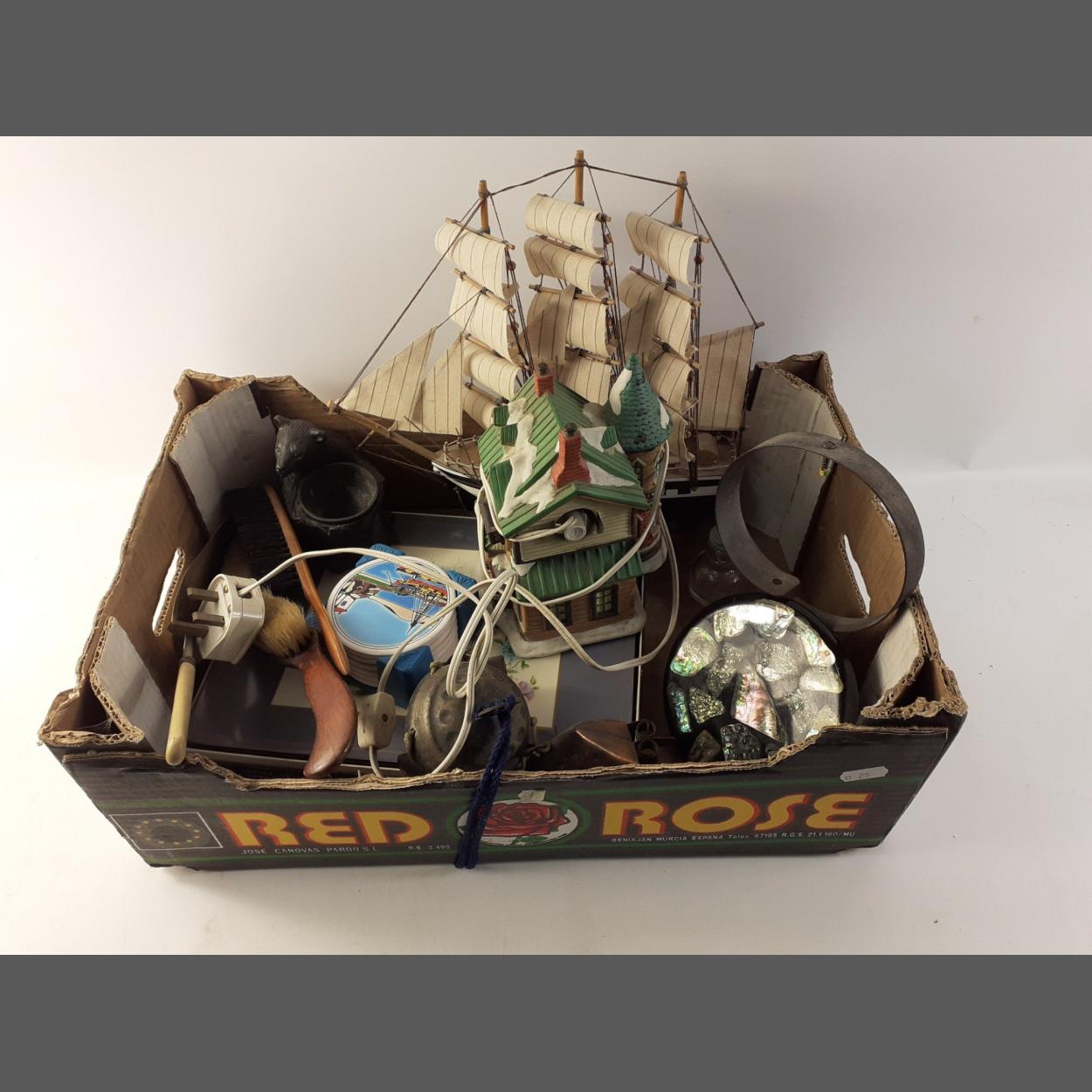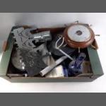 A mixed box to include a trivet with abalone shell, cow bells, servant's/shop door bell, crumb brush and pan, etc