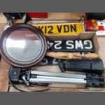 A mixed box to include a wooden framed mirror, rear car trailer light assembly, 2 old car registration numbers, a telescopic camera tripod etc