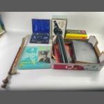 A mixed lot to include a complete GOWLLANDS MAY OPHTHALMOSCOPE No 2 diagnostic boxed set, a COC microscope, a Microscopy Kit - portable biological laboratory, a pair of nunchucks, 2 long shoehorns, 2 joiners expanding measures, a copy of HEALTHY MINDS AND BODIES edited by Frank Preston, plus a Black Bob - The Dandy Wonder Dog annual, a few records including Harry Secombe and Glenn Miller