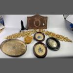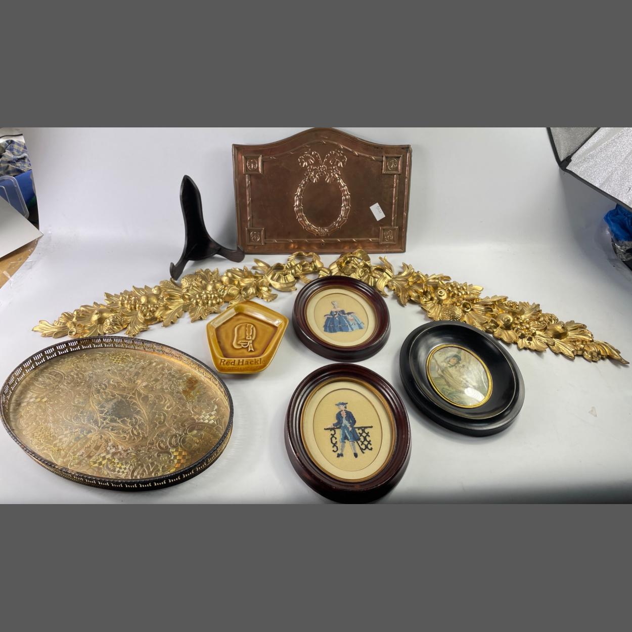 A mixed lot to include 2 gold-coloured decorative plaster pieces, a VINER'S plate pierced gallery tray 39cm long, 2 fine tapestry oval pictures of a lady and gent 22x19cm, an oval framed print of a Victorian child with peacock fan (24cm long), a copper plaque 40x30cm approx, a Red Hackle ashtray etc