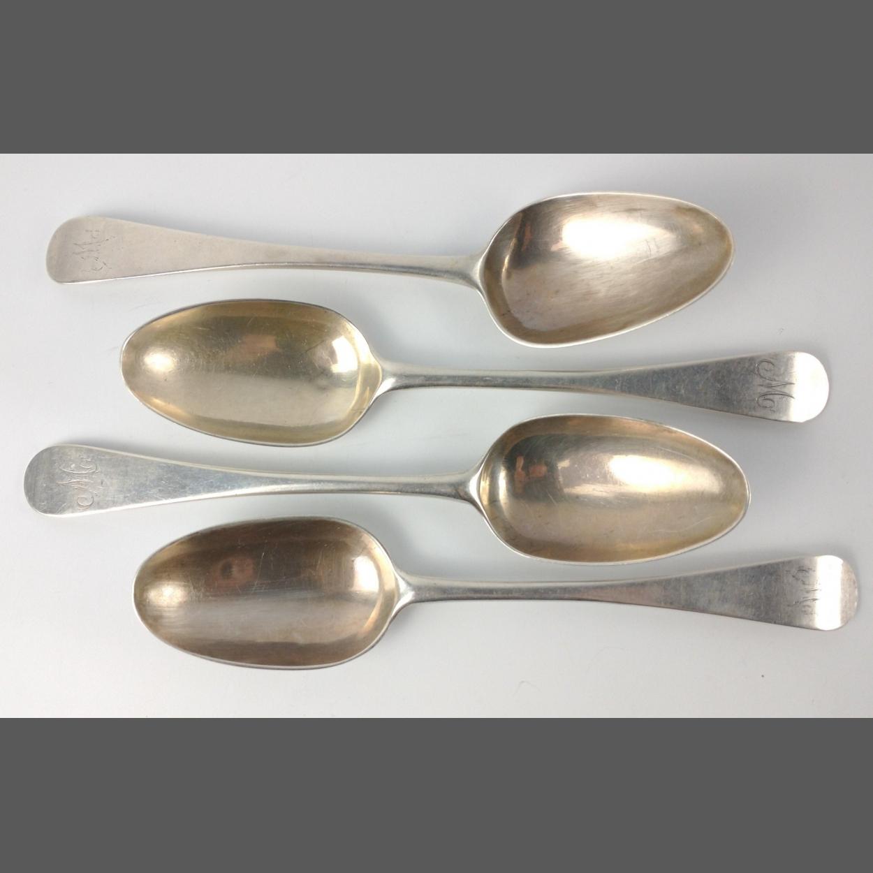 Four EDINBURGH silver hallmarked 1784 SPOONS by silversmiths WILLIAM & PETER CUNNINGHAM length 20cm, gross weight 270g