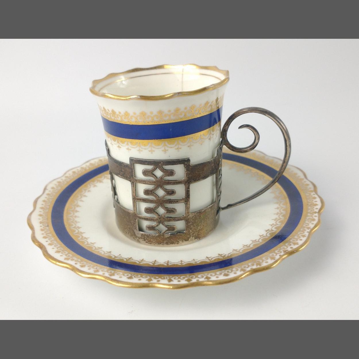 An AYNSLEY gilded COFFEE CAN and saucer with a silver WALKER & HALL, Sheffield hallmarked 1925 cup holder, this is for a most stylish solid silver cup holder dating to the Art Deco era with very pretty Aynsley coffee can plus saucer. The holder is elegantly styled with geometric ladder-shaped 'windows' and simple 'bass clef' handle showing key elements of Art Deco design , the beaker has a tiny chip and a historical crack.