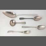 An assortment five London hallmarked SILVER PIECES to include 1806 tablespoon, 1819 mustard spoon, 2 teaspoons and a small ladle gross weight 115g.