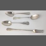 Four pieces of Scottish hallmarked silver to include a 1881 GLASGOW TEASPOON by silversmith T. SMITH & SONS, an 1876 EDINBURGH teaspoon by silversmith MACKAY, CUNNINGHAM & CO, and a 1856 EDINBURGH teaspoon by silversmith JAMES WRIGHT, and a 1996 EDINBURGH PICKLE FORK by silversmith ALAN R BAILLIE, gross weight 80g.