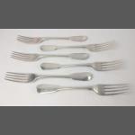 Four London silver hallmarked 1805 FORKS by silversmith THOMAS WILKES-BARKER, length 16.5cm, gross weight 106g, plus two London silver hallmarked 1814 FORKS by silversmith G. W., length 16.5cm, gross weight 67g.