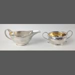 A silver London hallmarked 1902 by silversmith CHARLES STUART HARRIS CRUET SET, with a pair of salts, complete with silver spoons and blue glass liners, dimensions 8.5cm x 6cm x 4.25cm, and 100g weight approx, this weight does not include liners, and also a London hallmarked 1900 silver MUSTARD POT, 8cm x 9.5cm x 4.5cm with blue glass liner and silver spoon, weight 96g without liner.