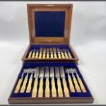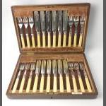 A boxed canteen of 12 Birmingham hallmarked 1874 ELKINGTON & CO DESSERT KNIVES & FORKS with decorative bone handles gross weight 450g