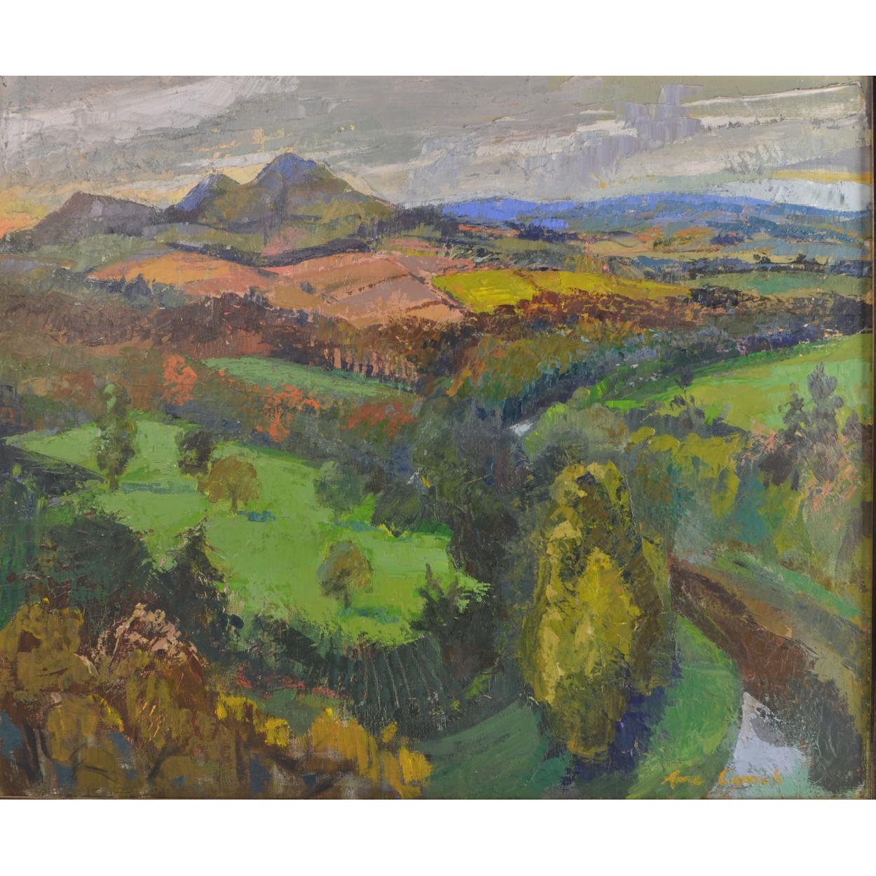 LOCAL INTEREST Framed ANNE CARRICK original oil on canvas SIGNED 1964 ' SCOTT'S VIEW depicting Scott's View looking towards Bemersyde, The River Tweed & Eildon Hills, VERSO showing Mainhill Gallery label