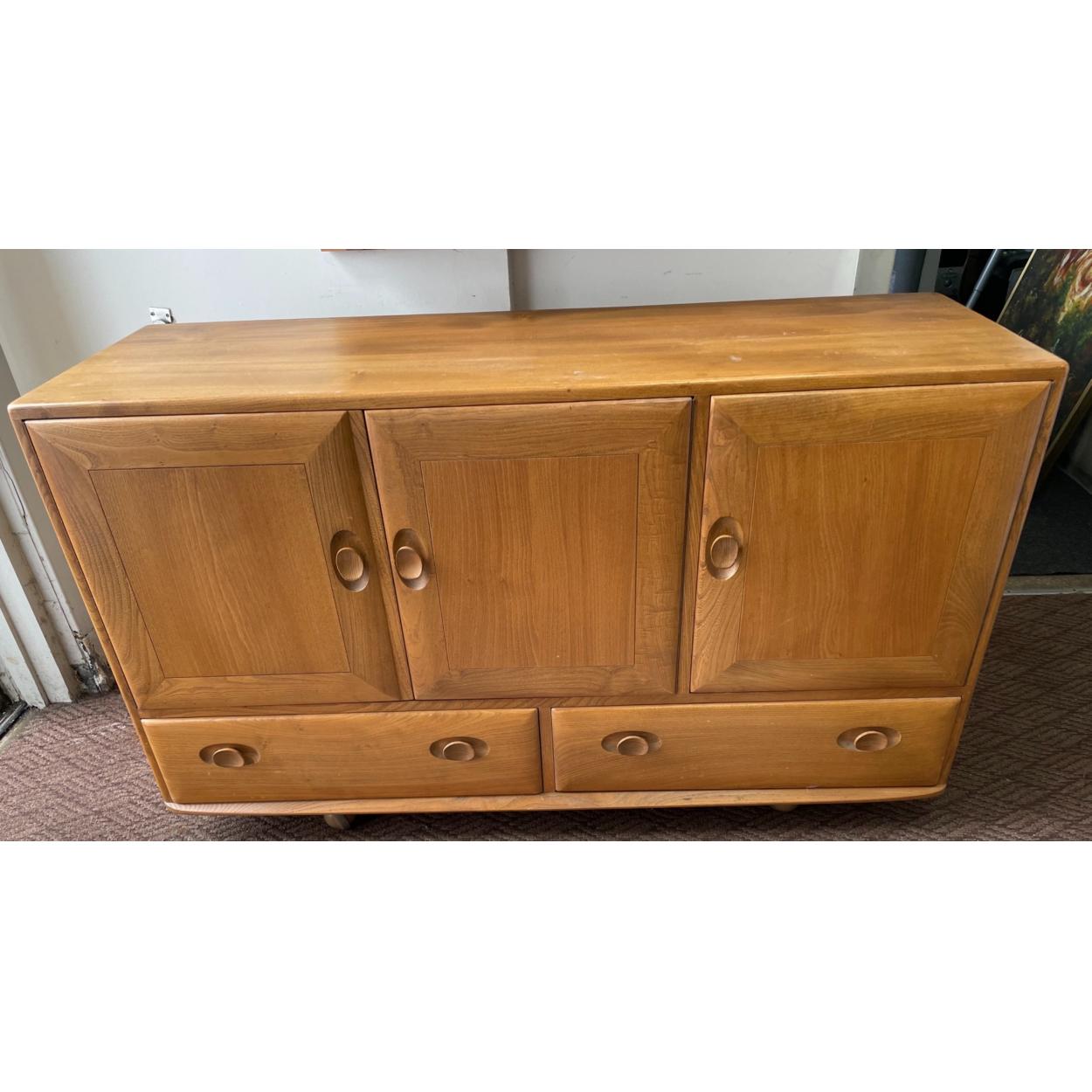 An ERCOL sideboard in light wood finish, two cupboards and two drawers, ERCOL label to the inside - dimensions length 130cm x 43cm depth x height 77cm approx