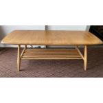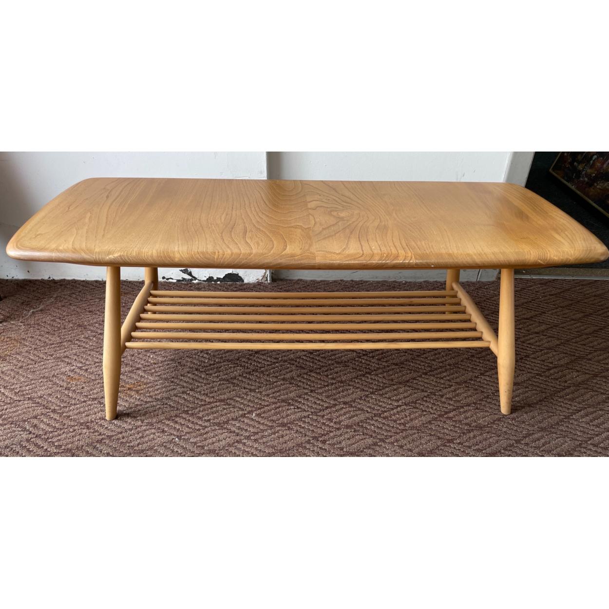 An ERCOL coffee table in light wood with magazine shelf, with ERCOL label verso, dimensions length 104cm x 45cm width x 35cm height approx