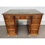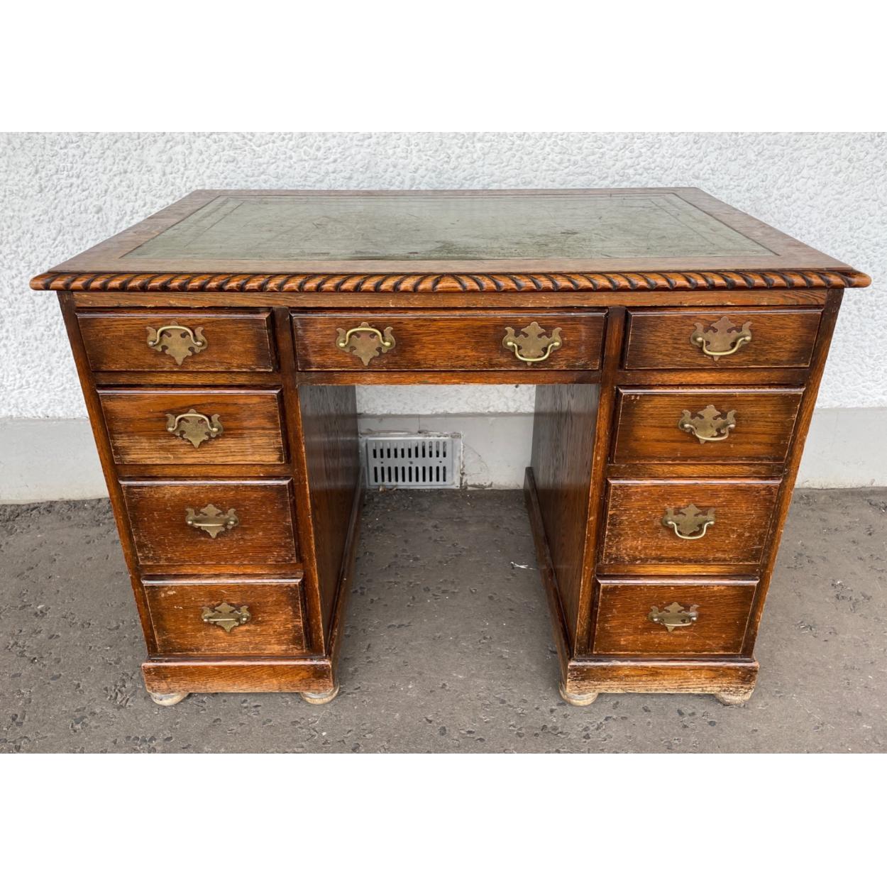 Vintage c1900 kneehole oak desk with green leather top, on bun feet, middle drawer, four graduating drawers either side, nine drawers in total - in a nice worn condition! Dimensions 106cm x depth 68cm x 77cm height approx