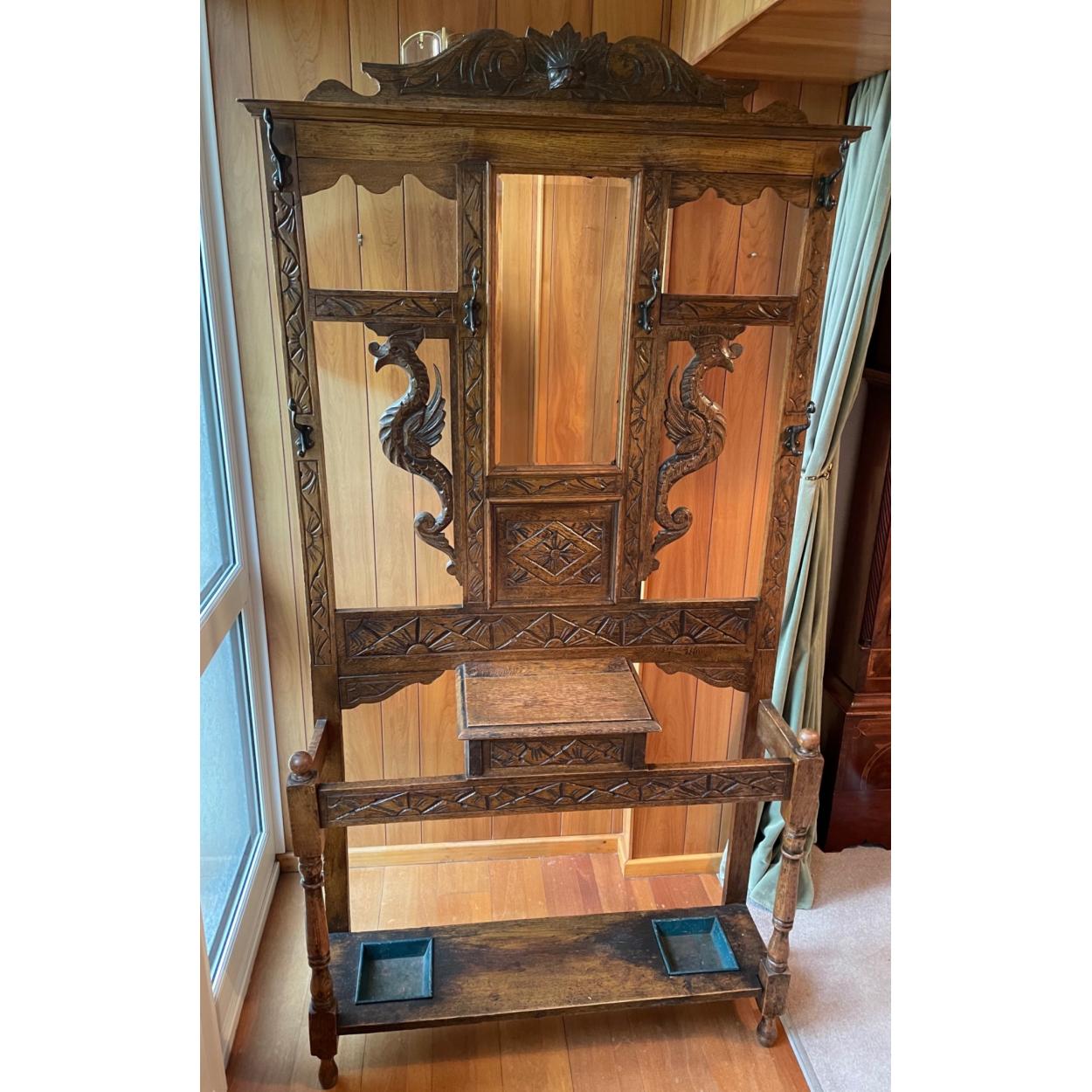 An UNUSUAL c1880's VICTORIAN WELSH DRAGON hand carved oak hall stick and stand with hooks and twin drip trays - dimensions 190cm high x width 101cm x depth 29cm approx