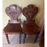 A pair of mahogany late Georgian/early Victorian HALL CHAIRS ( one leg has sustained damage but wood intact) dimensions 39cm wide x 35cm depth x 82cm high