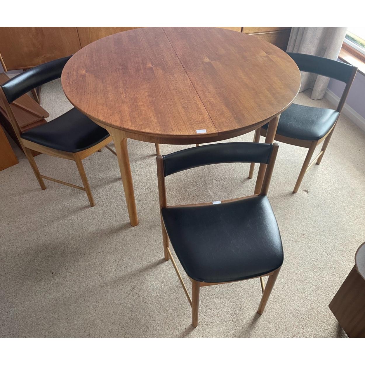 A McIntosh (Kirkcaldy) extending teak dining table and four chairs (122cm diameter) The four chairs have the model Number 966 stamped on the underside.