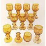 Ten vintage smoky glass hock glasses 12cm high (one damaged) with etched design
