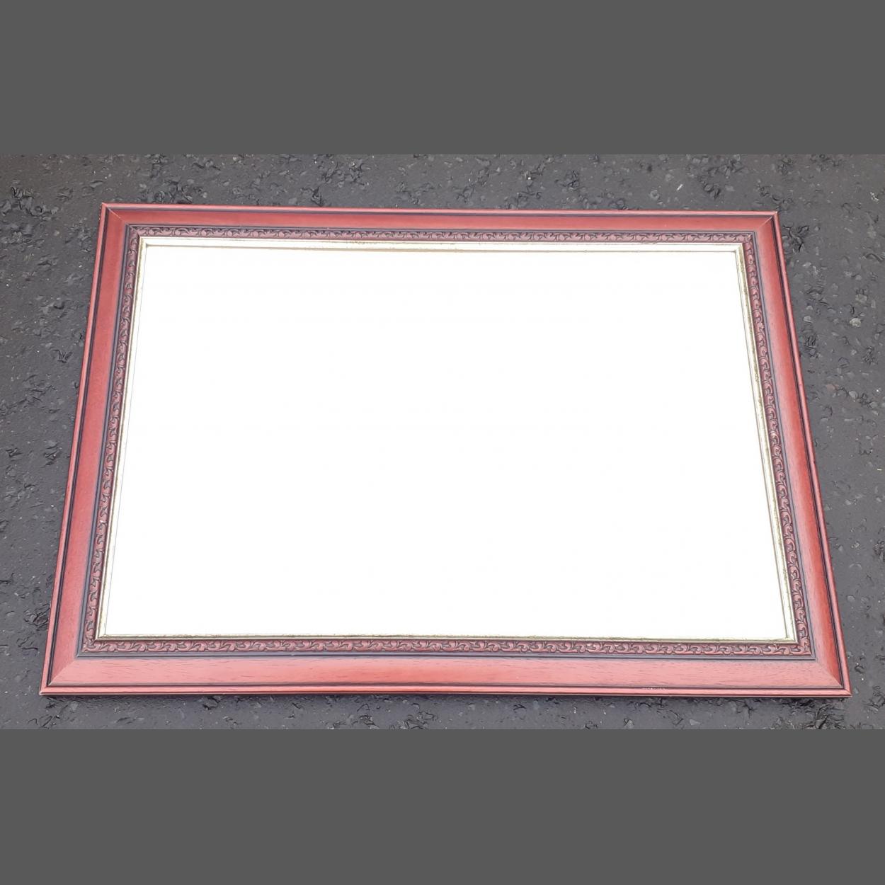 Useful and attractive wood framed bevelled edge mirror in good condition. Measures 87cm x 62cm approx.