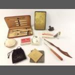 A super little collection of items of interest to include cased manicure set, gilt compact, lovely screw top scent bottle, Royal Albert Beatrix Potter key ring in box, 1981 brass Christmas postcard, shell compact and an unopened pack of 20 Park drive cigarette