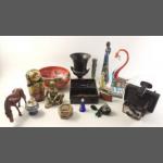 A mixed lot of pretty decorative items to include a WEDGWOOD urn (AF), MALING bowl (AF), glass swan, a brass deity, WEDGWOOD table lighter, 2 perfume bottles, Polaroid camera, etc