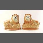 Pair of antique Staffordshire Ceramic flatbacks in the form of recumbent lions. Nice pieces with glass eyes and in good condition. Each 26cm across at the base approx.