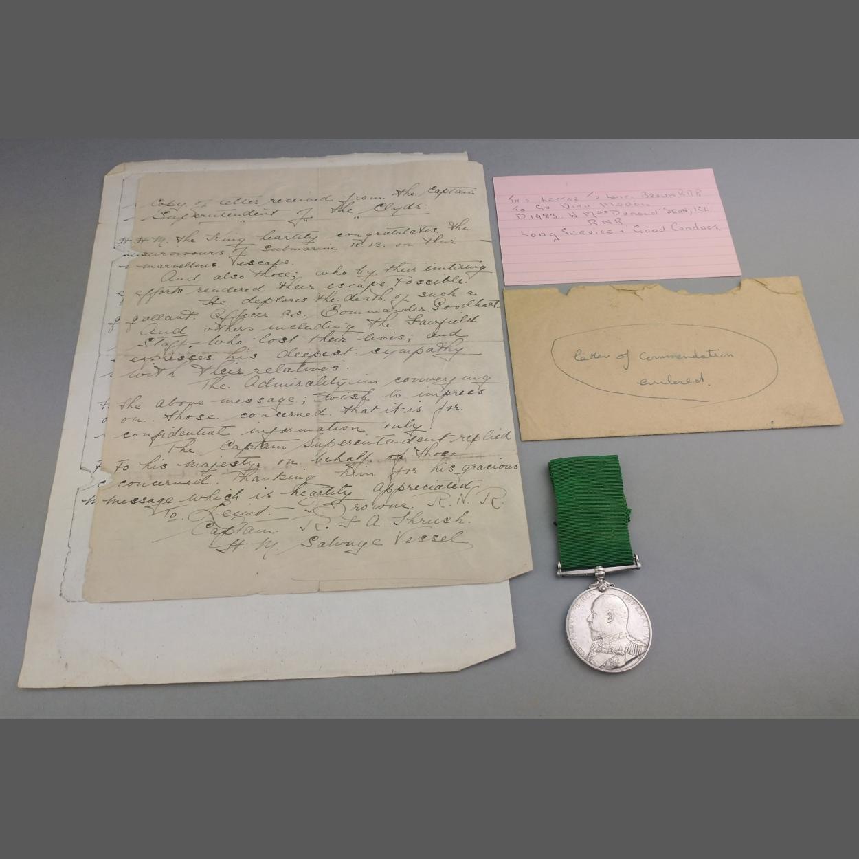 EDWARD VII Royal Naval Reserve Long Service and Good Conduct Medal D.1923 W. McDonald Sean. 1cl. RNR. Comes with a copy letter referencing his involvement in the rescuing of survivors sinking of the submarine K.13 in 1917.