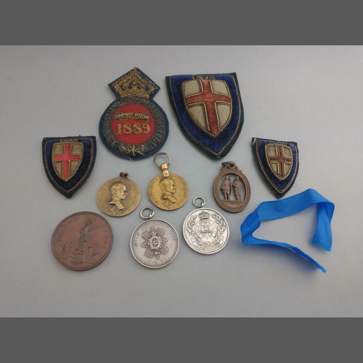 A small collection of Rifle Club and other patches and medals including late Victorian padded patches, 1933 42nd Regiment Black Watch and others