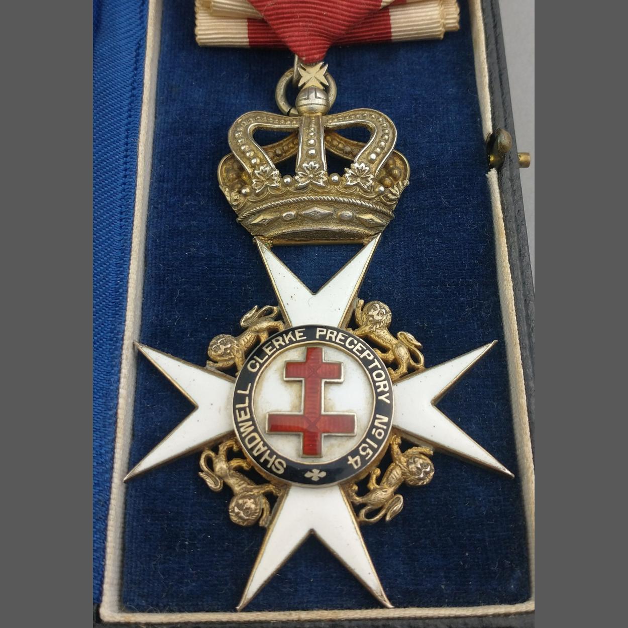 MASONIC handsome cased substantial enamel and silver hallmarked Masonic jewel Shadwell Clarke Preceptory No. 154. Presented to E. Knight W.E. Hall in recognition of his services as EP 1941-1942