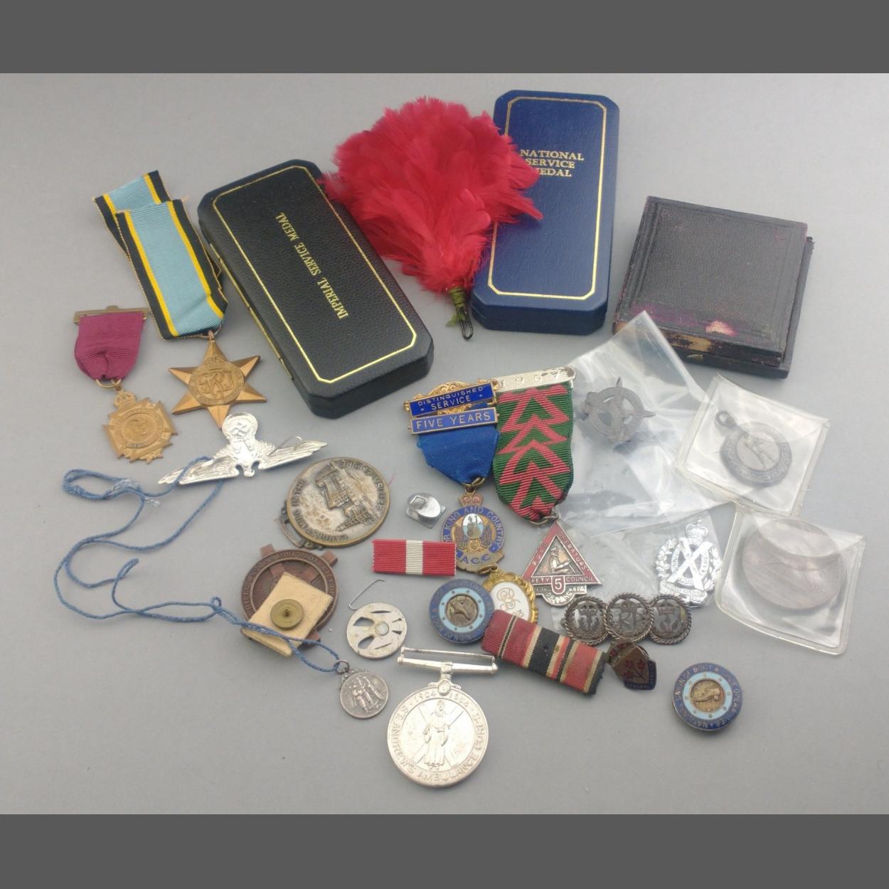 A mixed lot to include empty medal boxes, a red cockade, a reproduction Air Crew medal, reproduction Swastika eagle wings and other small medals and buttons of interest