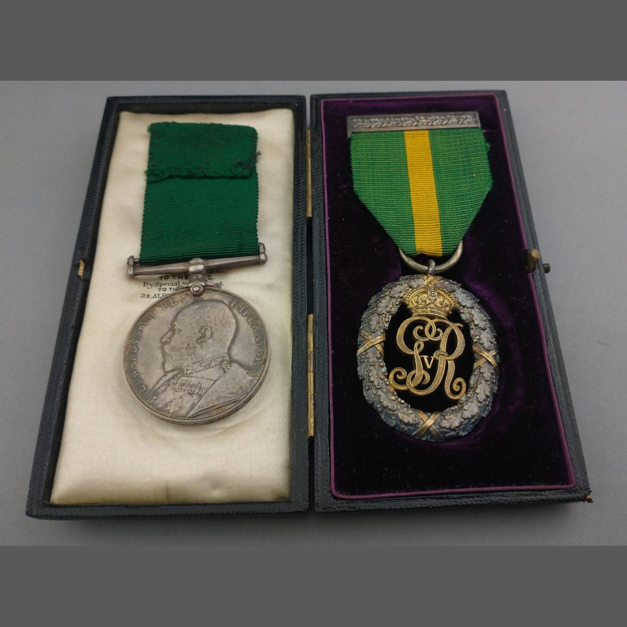 GEORGE V Territorial decoration in presentation case, made by royal jeweller's GARRARD'S. Also a Edward VII Long Service in the Volunteer Force Medal. Mames Lt. A Dunnett 1st Sutherland