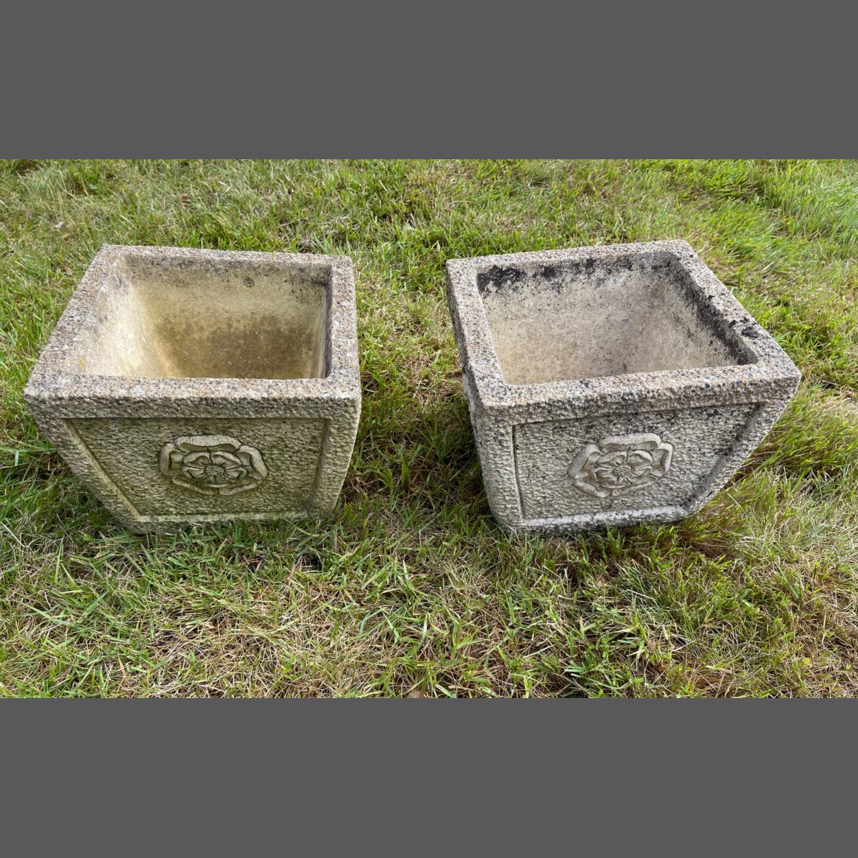 A pair of stone effect garden planters both with a rose motif decoration - 28cm square approx