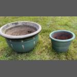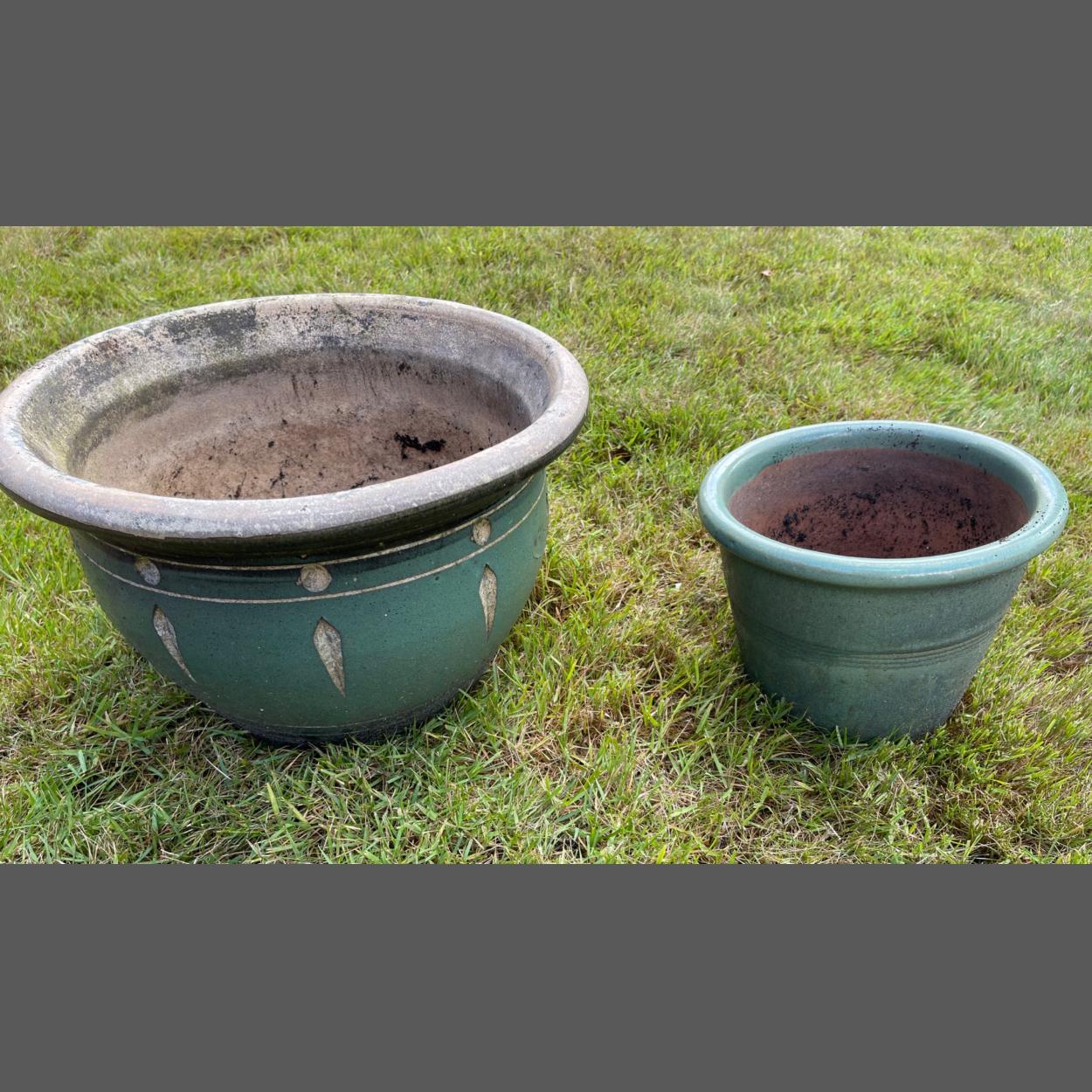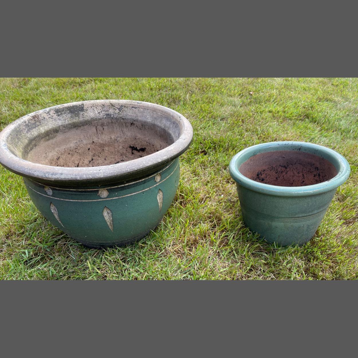 Two ceramic green glazed garden planters, one large and the other smaller