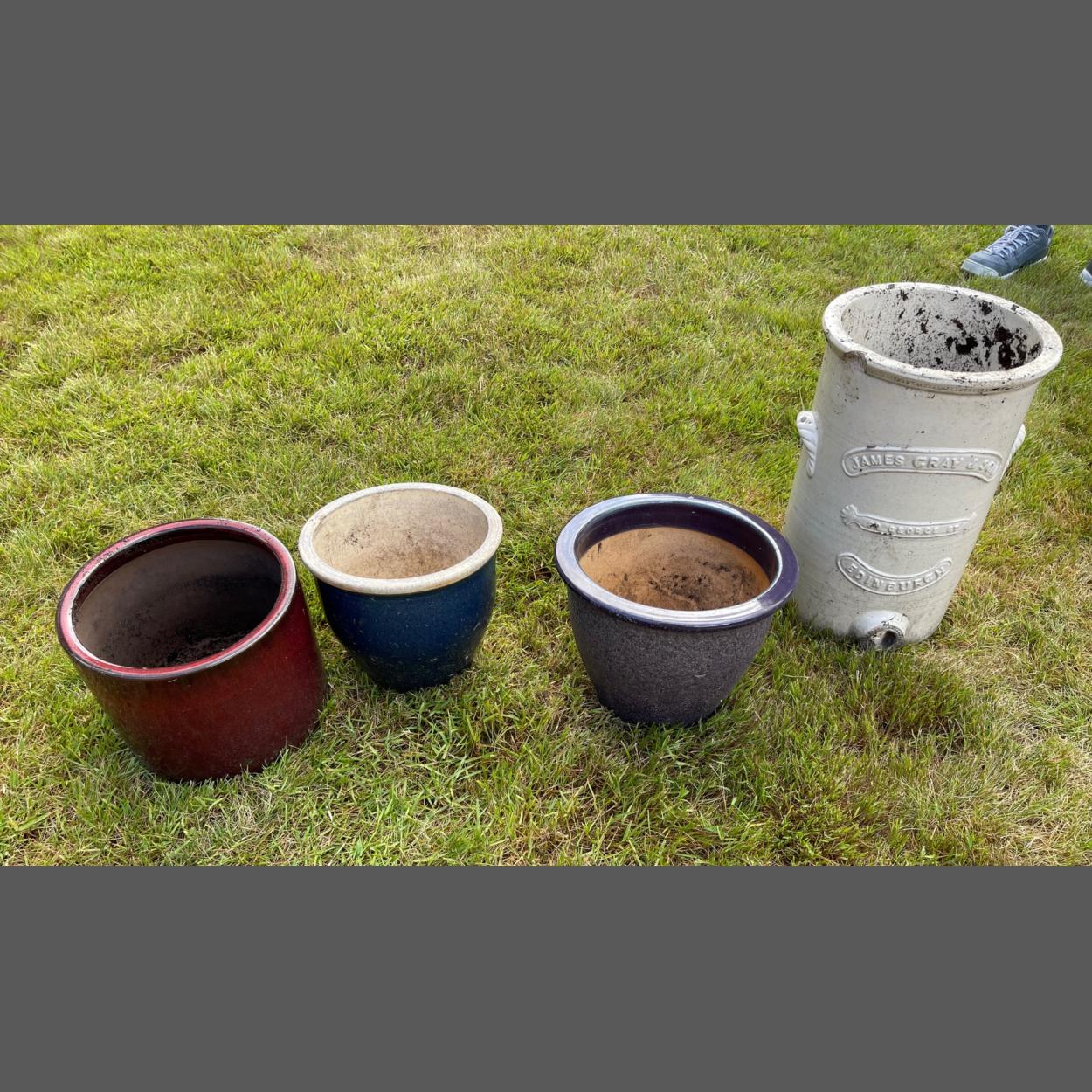 FOUR ceramic garden planters to include a James Gray & Co of Edinburgh tallish white planter