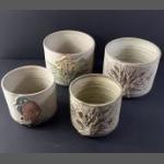 Two vintage TREGARON, CYMRU Tree of Life pottery plant holders (14cm dia x 12cmH and 11cm dia x10cm H), plus two TREGARON, CYMRU plant holders one with a raised primrose design, (14x12cm) and the other with a raised kingfisher (11cm dia x 10cm H)