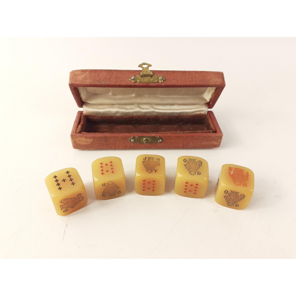 A lovely set of five vintage celluloid POKER DICE in fitted case. Box length 9cm. Aged wear but lovely condition.