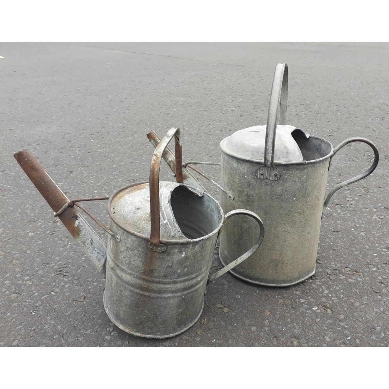 PERFECT for the GARDEN! Two VINTAGE galvanised watering cans. The larger can measures approx. H43cm with 25cm diameter, and the smaller can measures approx. H34cm x 21cm in diameter.