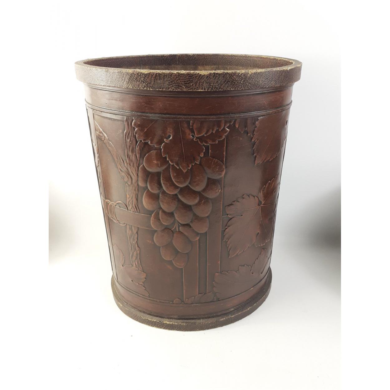 An oval-shaped leather wastepaper basket decorated with bunches of grapes, stands 33cm high 25cm width