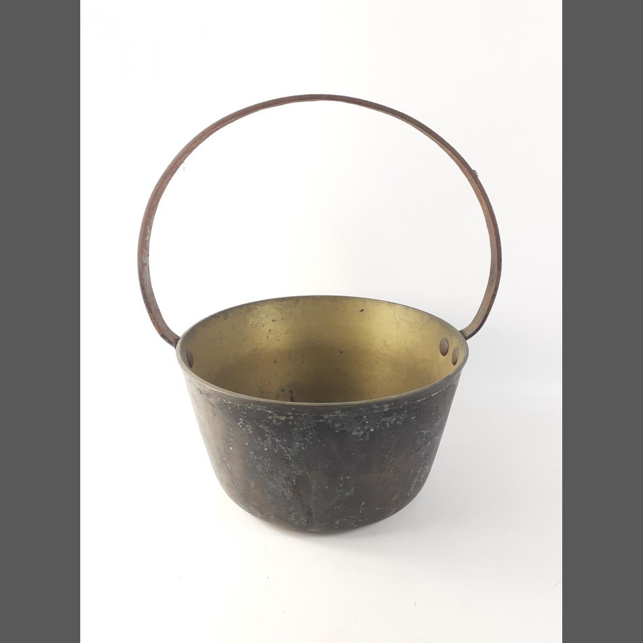 A heavy weight jelly pan standing approx 40cm to top of handle, 29cm dia approx