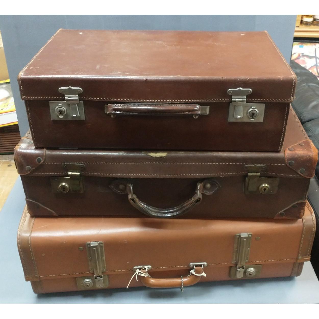 Three vintage cardboard suitcases (65 x 42cm, 50 x 30cm and 60 x 35cm approx) with contents of a brass magazine rack, and set of taps.