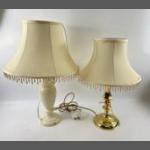Sale cancelled due to non-payment. Will be rentered into 12th Feb 22 general auction. Two table lamps with shades to include white marble style base lamp (H: 52cm approx) and slender brass lamp (H: 72cm approx)