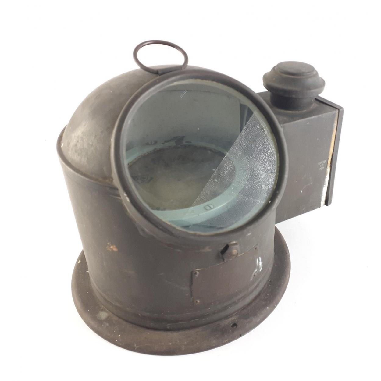 A SESTREL R/79/818/14 COMPASS in metal marine binnacle with burner lamp to side. Stands 22cm tall approx. In good honest used condition.